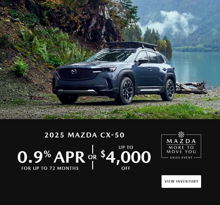 2025 Mazda CX-50 2.5 S Premium Plus AWD (Model #: C50PPXA). MSRP $40,485.00. $570 per month for 60 months at 0.90% APR, with $4,048.00 down payment on approved credit. Must finance through Mazda Financial Services. Includes Freight. Does not include tax, tag, processing and $899 dealer doc fee. The payment quote above assumes that these taxes and fees will be paid at the time of sale by the customer in addition to the down payment amount stated. If these taxes and fees are not paid by customer at the time of sale, the quoted payment will be higher since these amounts will be included in the amount financed. Residential restrictions may apply. In stock units only. Dealer installed accessories are extra. - Expires 01/02/2026