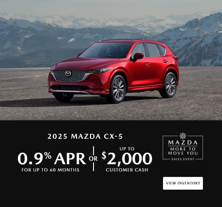 2025 Mazda CX-5 2.5 S Select AWD (Model #: CX5SEXA). MSRP $31,960.00. $501 per month for 60 months at 2.90% APR, with $3,196.00 down payment on approved credit. Must finance through Mazda Financial Services. Includes Freight. Does not include tax, tag, processing and $899 dealer doc fee. The payment quote above assumes that these taxes and fees will be paid at the time of sale by the customer in addition to the down payment amount stated. If these taxes and fees are not paid by customer at the time of sale, the quoted payment will be higher since these amounts will be included in the amount financed. Residential restrictions may apply. In stock units only. Dealer installed accessories are extra. - Expires 01/02/2026