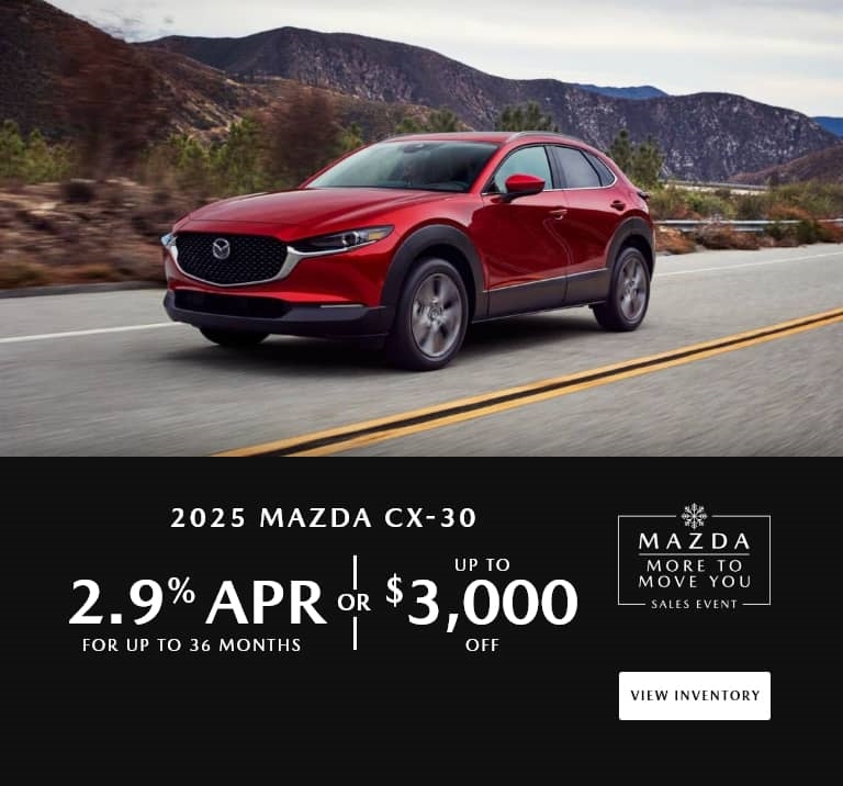 2025 Mazda CX-30 2.5 S Preferred AWD (Model #: C30PFXA). MSRP $31,165.00. $500 per month for 60 months at 4.90% APR, with $3,116.00 down payment on approved credit. Must finance through Mazda Financial Services. Includes Freight. Does not include tax, tag, processing and $899 dealer doc fee. The payment quote above assumes that these taxes and fees will be paid at the time of sale by the customer in addition to the down payment amount stated. If these taxes and fees are not paid by customer at the time of sale, the quoted payment will be higher since these amounts will be included in the amount financed. Residential restrictions may apply. In stock units only. Dealer installed accessories are extra. - Expires 01/02/2026