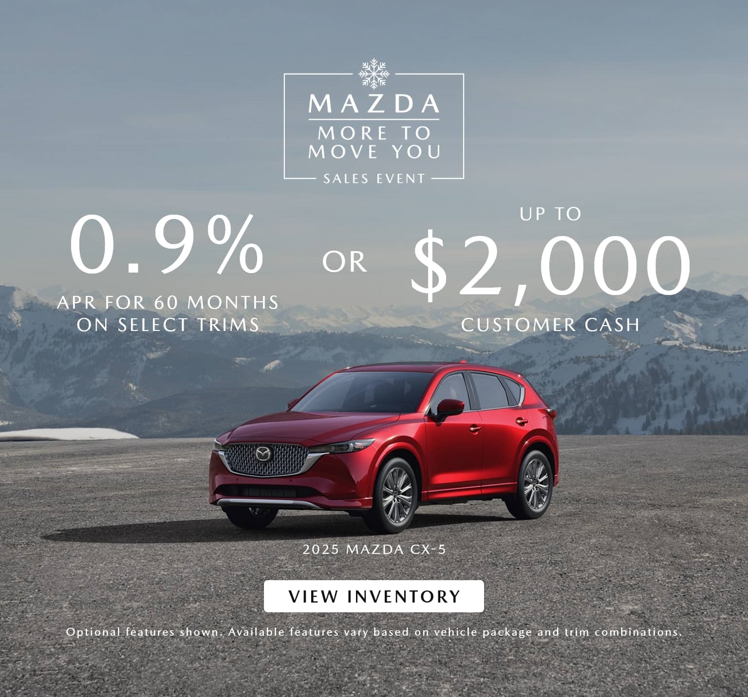 2025 Mazda CX-5 2.5 S Select AWD (Model #: CX5SEXA). MSRP $31,960.00. $501 per month for 60 months at 2.90% APR, with $3,196.00 down payment on approved credit. Must finance through Mazda Financial Services. Includes Freight. Does not include tax, tag, processing and $899 dealer doc fee. The payment quote above assumes that these taxes and fees will be paid at the time of sale by the customer in addition to the down payment amount stated. If these taxes and fees are not paid by customer at the time of sale, the quoted payment will be higher since these amounts will be included in the amount financed. Residential restrictions may apply. In stock units only. Dealer installed accessories are extra. - Expires 12/01/2025