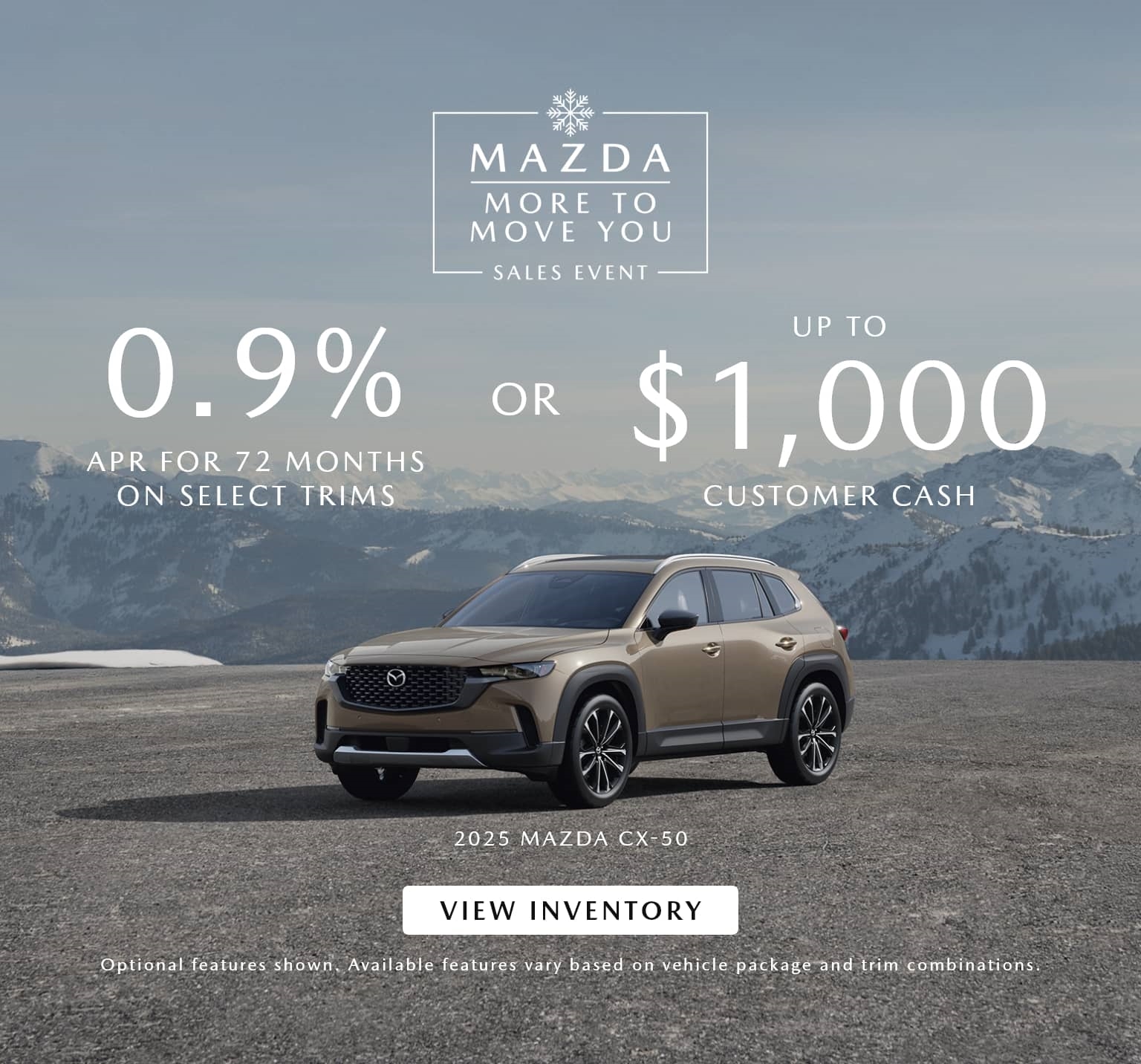 2025 Mazda CX-50 2.5 S Preferred AWD (Model #: C50PFXA). MSRP $34,330.00. $484 per month for 60 months at 0.90% APR, with $3,433.00 down payment on approved credit. Must finance through Mazda Financial Services. Includes Freight. Does not include tax, tag, processing and $899 dealer doc fee. The payment quote above assumes that these taxes and fees will be paid at the time of sale by the customer in addition to the down payment amount stated. If these taxes and fees are not paid by customer at the time of sale, the quoted payment will be higher since these amounts will be included in the amount financed. Residential restrictions may apply. In stock units only. Dealer installed accessories are extra. - Expires 12/01/2025